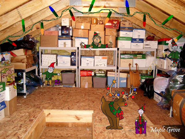 It's that time of year again! Time to deck the halls! So I climbed up into the attic to retrieve my boxes of Christmas decorations. There they are . . . right where I left them last year (I think). Well, I better get busy, because there aren't any elves who are going to come and do it while I'm sleeping (are there?).